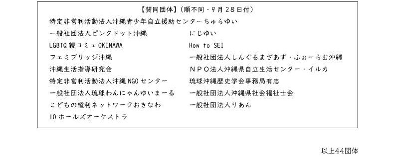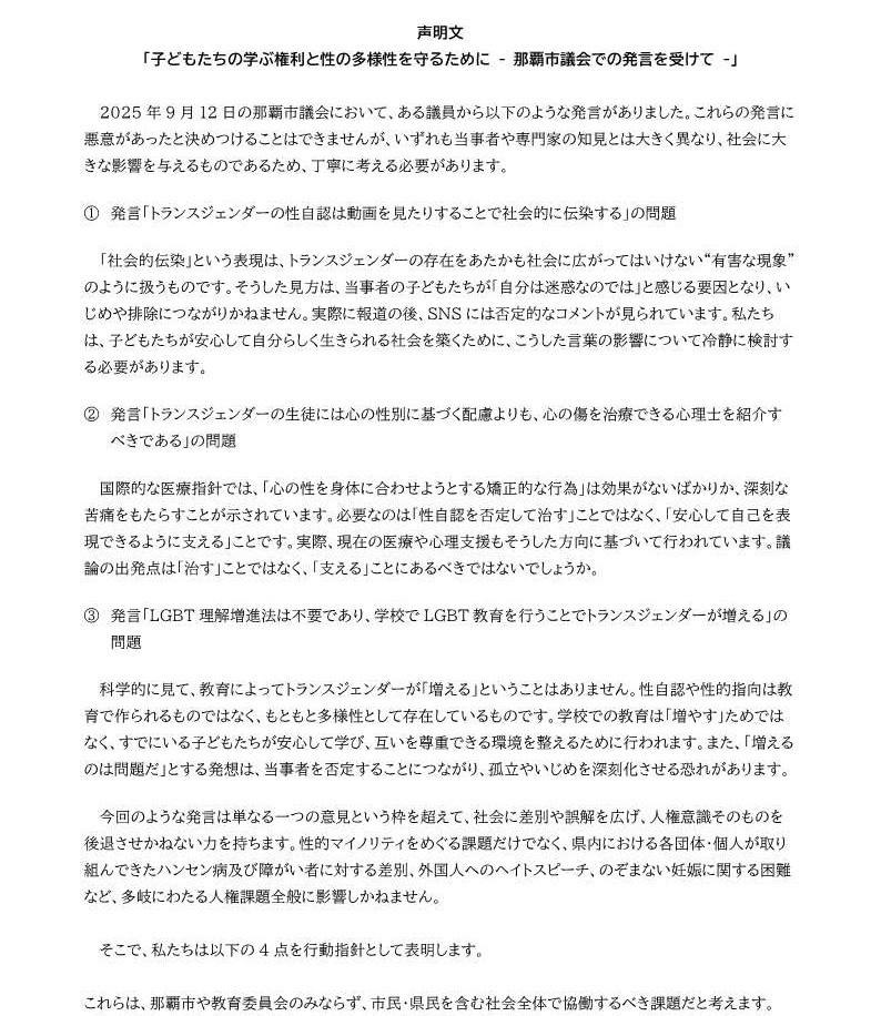 声明文(呼びかけます) 投稿者: okiseikyo | 2025-10-01 0件のコメント私たち「沖縄県“人間と性”教育研究協議会」は、「てぃーだあみ」をはじめとする、各種団体とともに下記の声明文を呼びかけます。 賛同いただける方は、知人等への周知をお願いします。